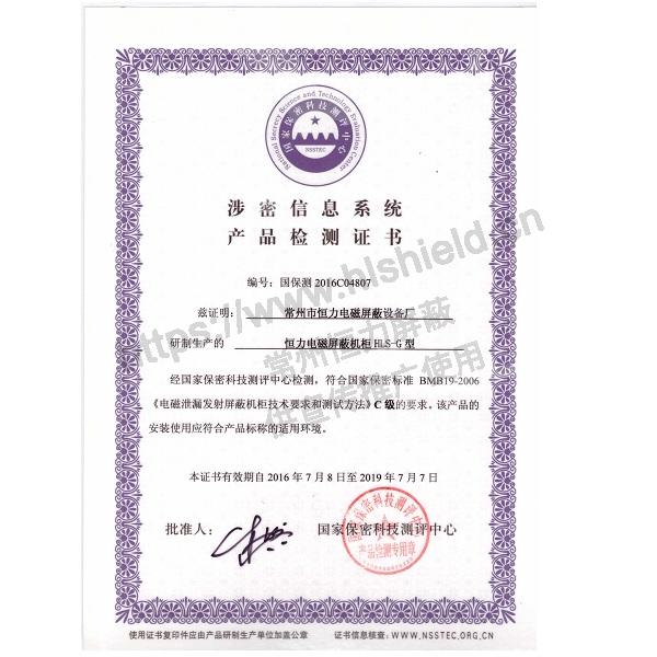 1. 具有國家保密局BMB19-2006《電磁泄露發(fā)射屏蔽機(jī)柜技術(shù)要求和測(cè)試方法》C級(jí)認(rèn)證的檢測(cè)證書及檢測(cè)報(bào)告(包含新增加功能:散熱、溫濕度監(jiān)控報(bào)警、屏效監(jiān)控報(bào)警功能檢測(cè))。