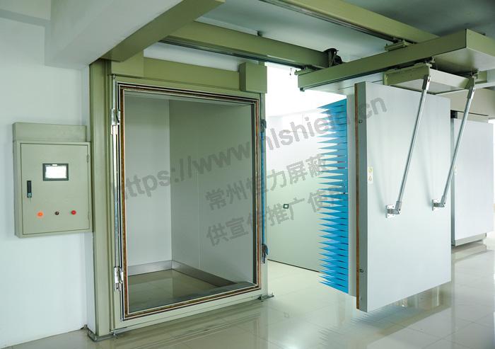 屏蔽門運動方式為:關門時首先橫向平移,然后縱向前行,屏蔽門運動到位后,四個斜楔鎖定機構工作,使門扇緩緩壓入門框上的簧片槽中形成電磁密封腔。采用雙刀四簧電磁密封結構從而保證屏蔽效能高且穩(wěn)定可靠。