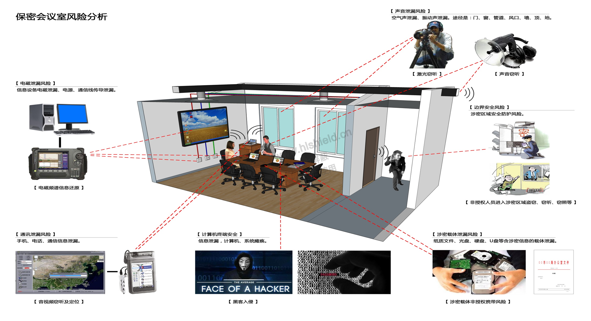 目前,隨著黨政機(jī)關(guān)、科研機(jī)構(gòu)、國防軍工和國有企業(yè)等單位的工作會議、技術(shù)交流、項(xiàng)目匯報、科研講座的增多,對現(xiàn)代視訊展示、數(shù)碼電聲處理、自動化電器處理等組成的多媒體聲、光、像會議系統(tǒng)和保密防護(hù)技術(shù)的需求越來越強(qiáng)烈。我們根據(jù)其實(shí)際應(yīng)用和需求,依據(jù)國家保密標(biāo)準(zhǔn)BMB26-2012《保密會議室保密要求和測試方法》的規(guī)定,結(jié)合會議涉及的涉密信息等級,對重要區(qū)域采取先進(jìn)的防護(hù)技術(shù)手段,我公司推出了保密會議室等重要區(qū)域的整體解決方案及系列專用產(chǎn)品,在功能和性能方面完全滿足各級保密部門不同密級的防護(hù)需求。